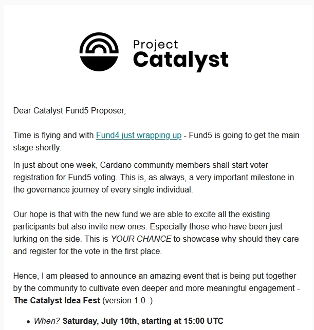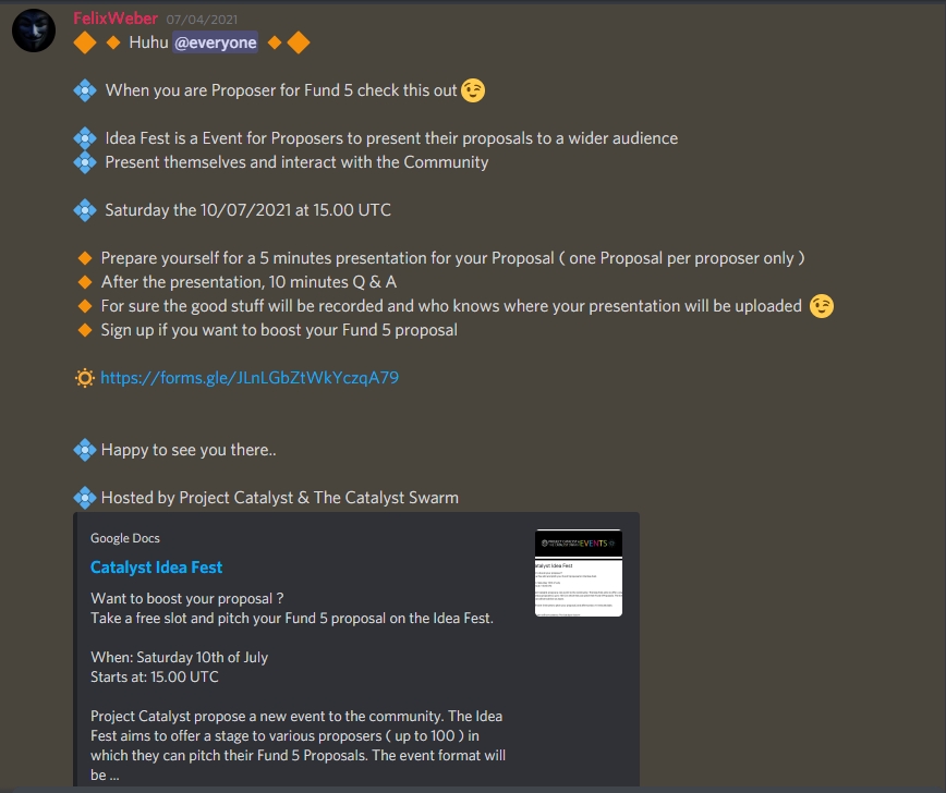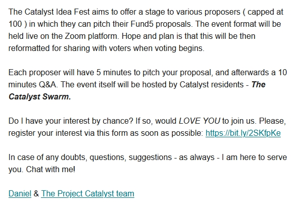This is an experiment and pilot. Please, be patient with all of us as we navigate this concept collectively. We appreciate your interest in participating. See you there, your Project Catalyst & Catalyst Swarm Crew