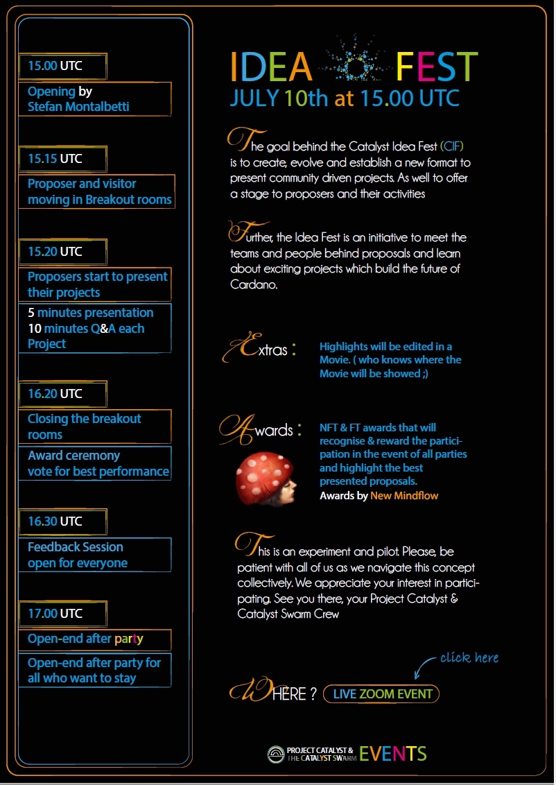 This was a community-run event. 🎯 IdeaFest goal? To connect voters and proposers ensuring a successful funding round 5. Learn more via this slide deck presentation: https://bit.ly/3qW3vJK Note: These are NOT all projects on the Fund5 ballot. These are the projects that decided and/or were able to participate in an inaugural Catalyst IdeaFest in order to bridge the gap between proposals and voters. For a complete list, please visit www.cardano.ideascale.com