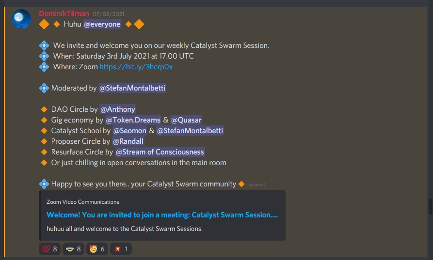 An open session for the Cardano Catalyst Swarm open space. The topic today was different models for how to allocate and record contributions of effort in a Decentralized Autonomous Organization (DAO).